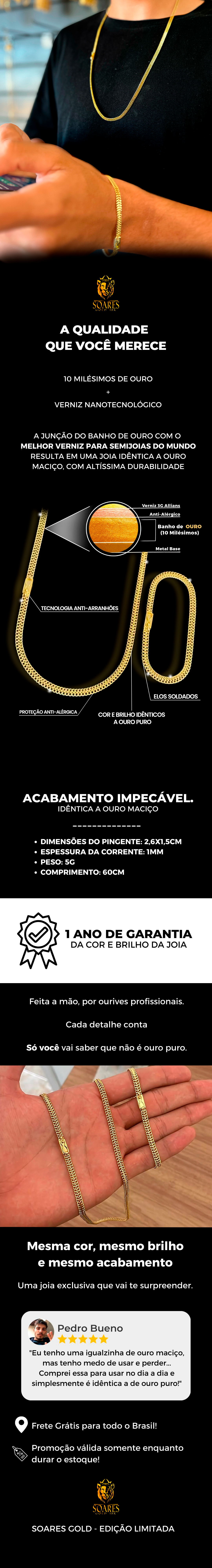 -Banho: O banho de ouro desta peça é composto por 10 camadas (Milésimos) de ouro 18 quilates, e revestido com o verniz Alemão Nanotecnológico capaz de blindar a peça proporcionando resistência e brilho!